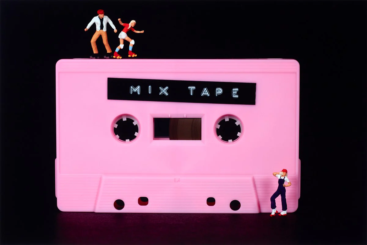 At the heart of this artwork lies a vibrant pink cassette tape, boldly labelled "MIX TAPE", set against a sleek black background that perfectly accentuates its vivid hue. Perched atop are miniature figurines; two appear to be lost in dance while another strikes a pose reminiscent of singing out loud. The contrast between their tiny forms and the iconic cassette creates a delightful playfulness that is undeniably enchanting.